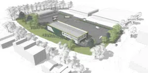 The branch will host Travis Perkins and Benchmarx trade counters, a warehouse, offices, and a tool hire workshop, with first floor mezzanine storage and staff welfare facilities.