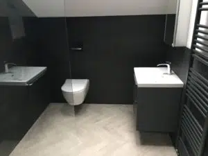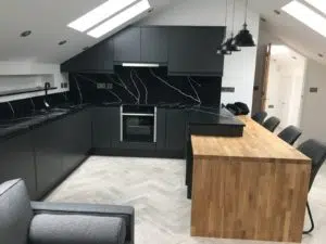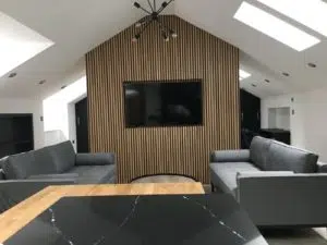 Given black/anthracite grey as the colour scheme, our interior designer created a modern open plan space that is cleverly carved one end to give privacy by a dual aspect wall; a media wall to the living space and wardrobes to the bedroom area.