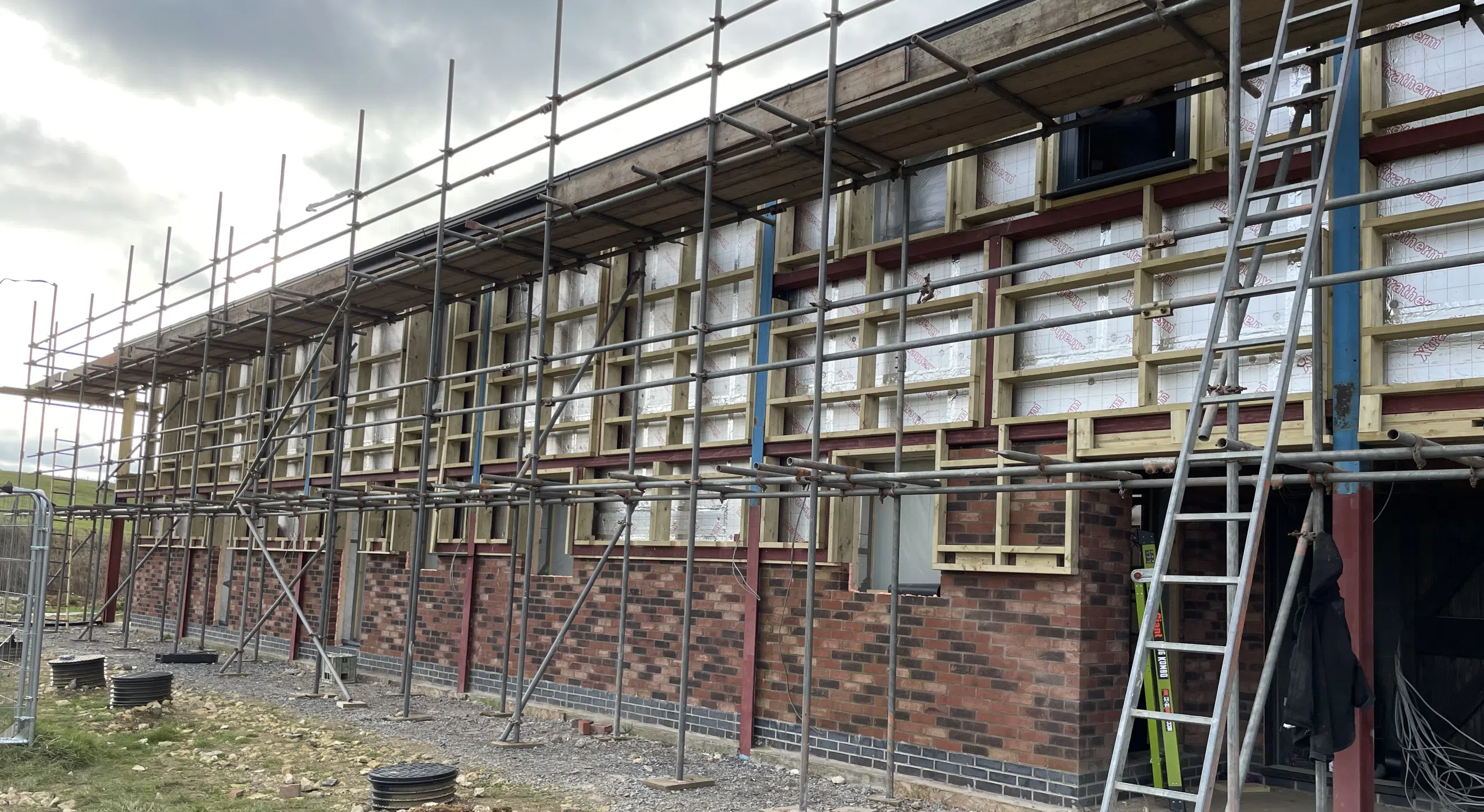 The existing steel frame has remained, but a new brick external skin has been built. The next steps will be the fitting of the burnt larch timber over-cladding to the walls to upgrade the exterior yet keep it true to the essence of its agricultural roots.
