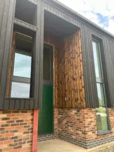 The front door is on and it’s really starting to feel like a new home. The burnt larch timber over-cladding provides a striking colour contrast to the brick and has been fitted to the walls to upgrade the exterior yet keep the barn true to the essence of its agricultural roots.